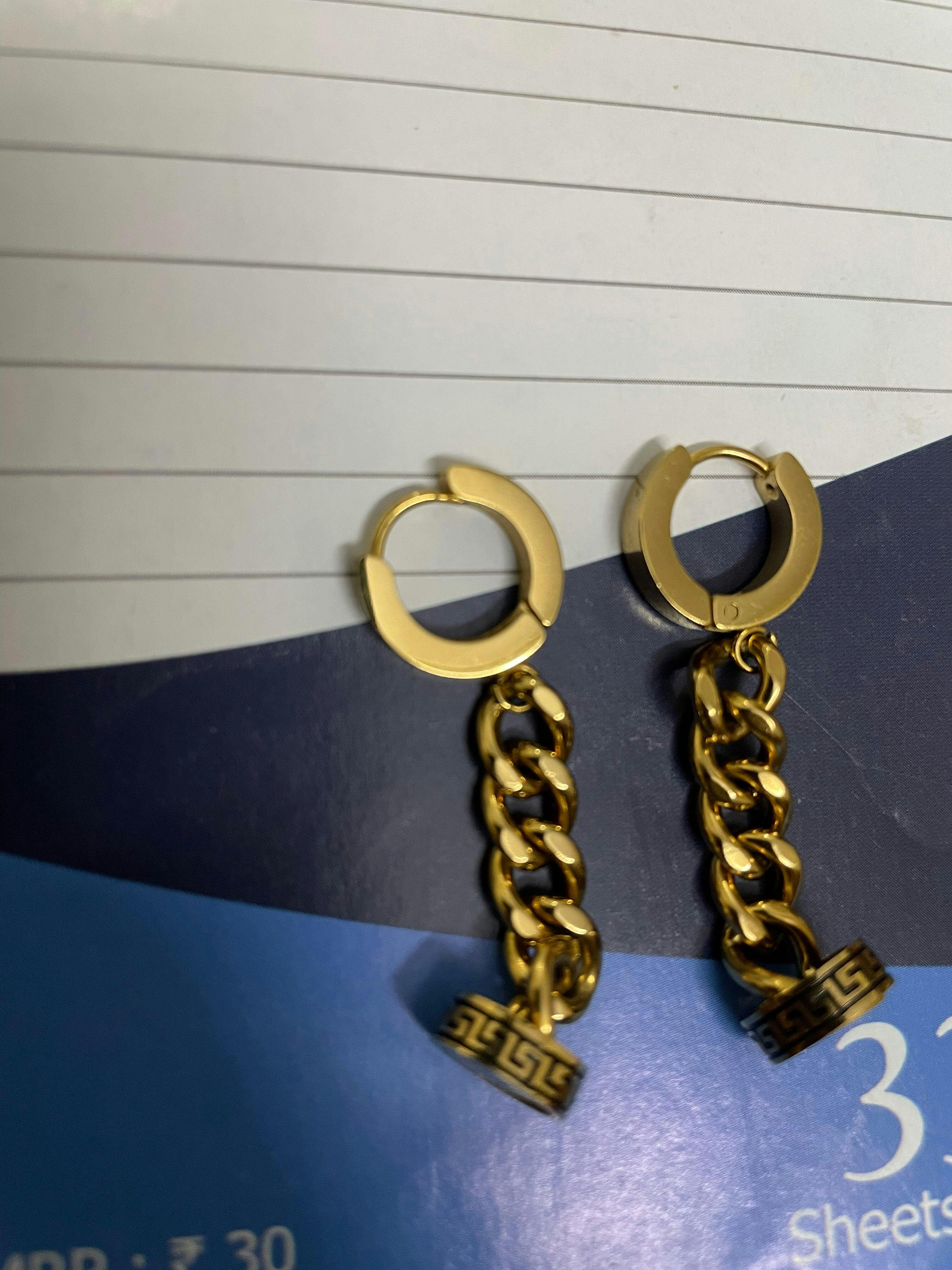 Stand out with Grecian Link Drops gold-toned, anti-tarnish hoops featuring bold chains and Greek key accents. Lightweight, customizable style for daily elegance and edge.